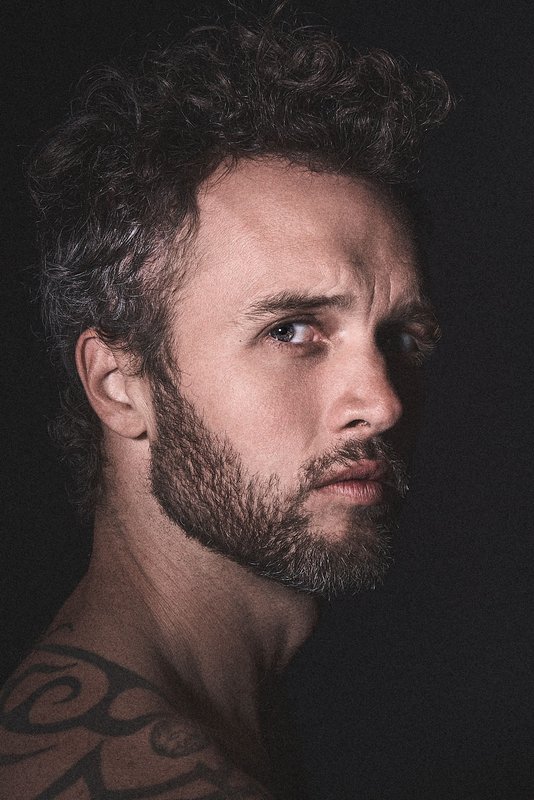 Dramatic Portrait of a Bald Man with Beard and Intense Gaze A dramatic, low-key portrait of a man with a shaved head and a full, dark beard. His face is sharply divided by shadow; the left side (from the viewer's perspective) is brightly illuminated, highlighting his striking green/hazel eye, which holds an intense, direct gaze. The right side of his face is shrouded in deep shadow, adding to the mystery and depth of the image. He wears a simple white V-neck t-shirt. The completely black background further emphasizes the subject and the stark contrast created by the dramatic lighting, conveying a powerful and contemplative mood.