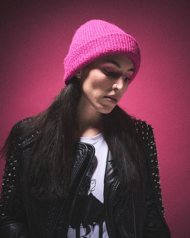 Edgy Chic: Woman in Pink Beanie and Spiked Leather Jacket A headshot and upper body portrait of a young woman with a striking, edgy style. She wears a vibrant hot pink knitted beanie and a black leather jacket adorned with numerous silver studs or spikes on the shoulders and arms. Her long, dark hair flows over her shoulders, framing her face. She has noticeable bright pink eyeshadow that matches her beanie, a small silver hoop nose ring, and stud earrings. Her expression is thoughtful, with her gaze directed downwards and slightly to her left. The background is a rich, solid magenta pink, creating a bold, monochromatic color palette. The image features dramatic lighting, casting shadows across her face, and a visible grainy texture, adding to its artistic and slightly rebellious aesthetic.